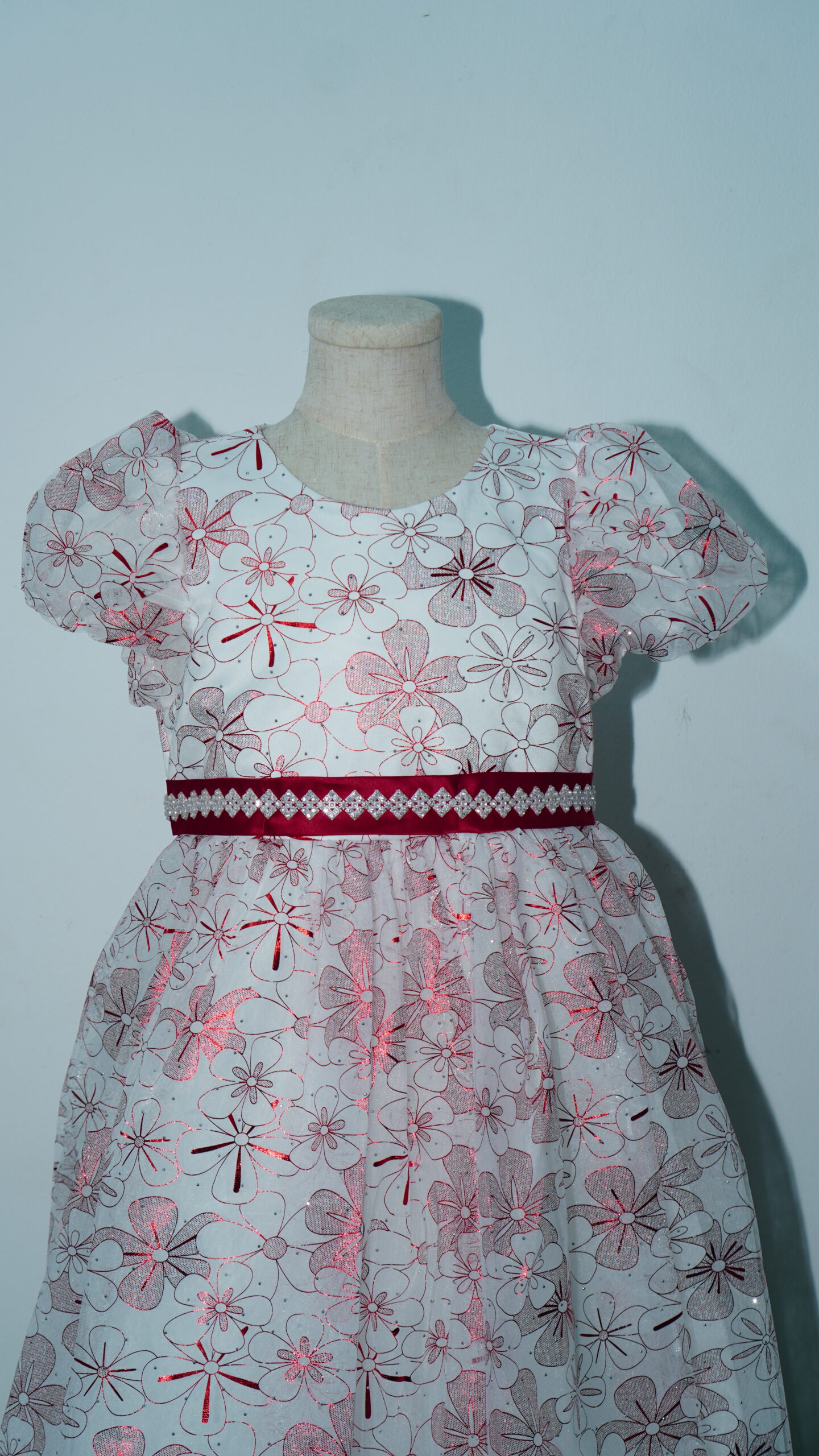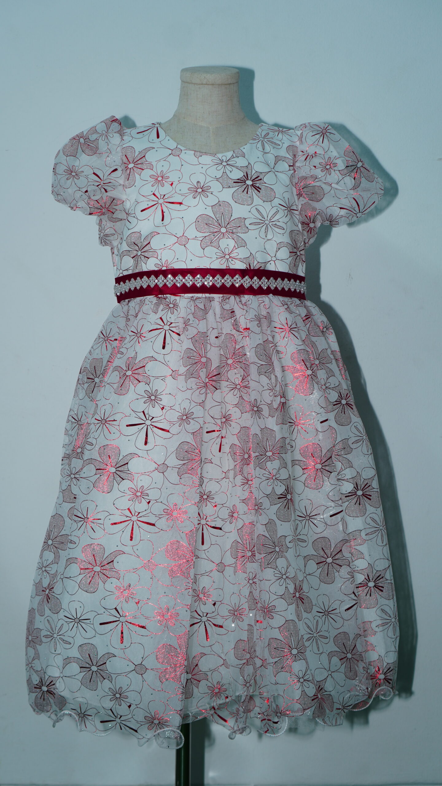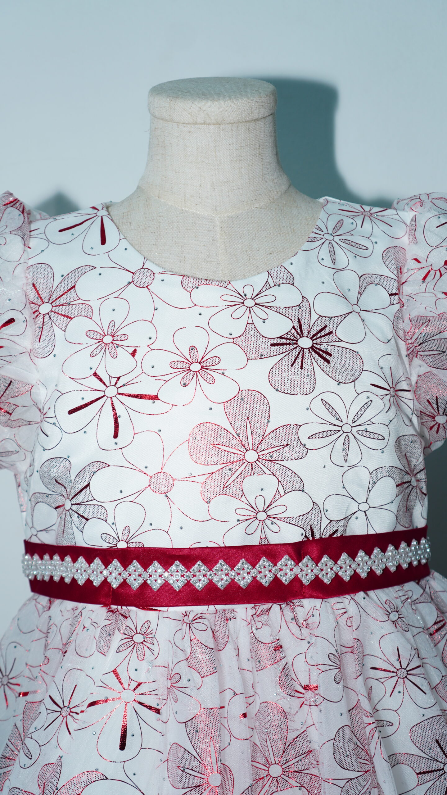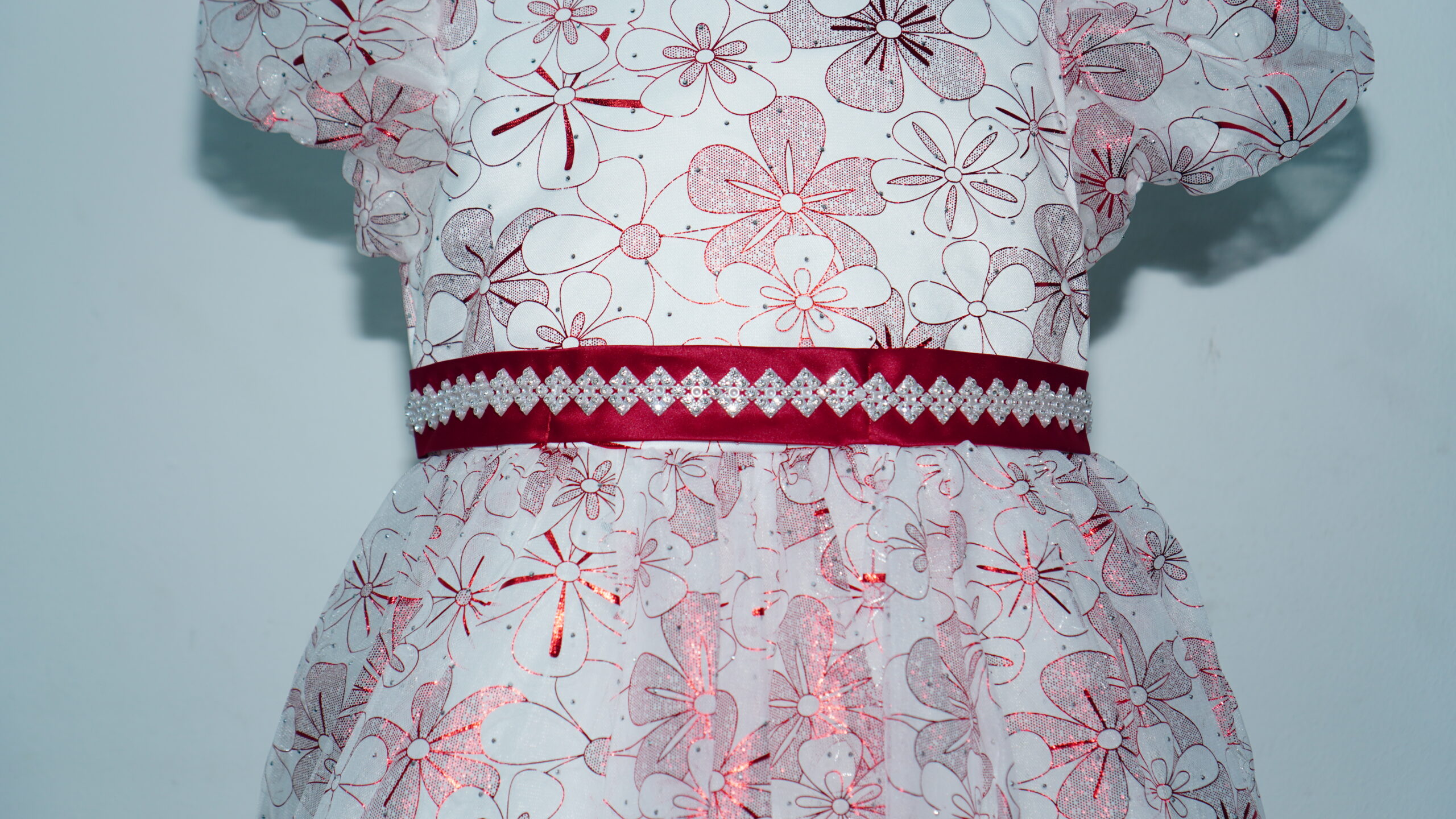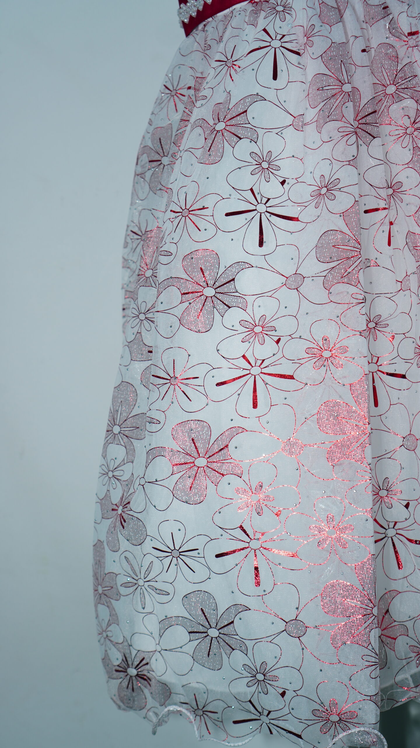 • Glistening Floral Overlay: The entire gown is wrapped in a high-quality white tulle overlay featuring a vibrant, all-over maroon floral pattern. The metallic shimmer within the red petals ensures she catches the light with every step.