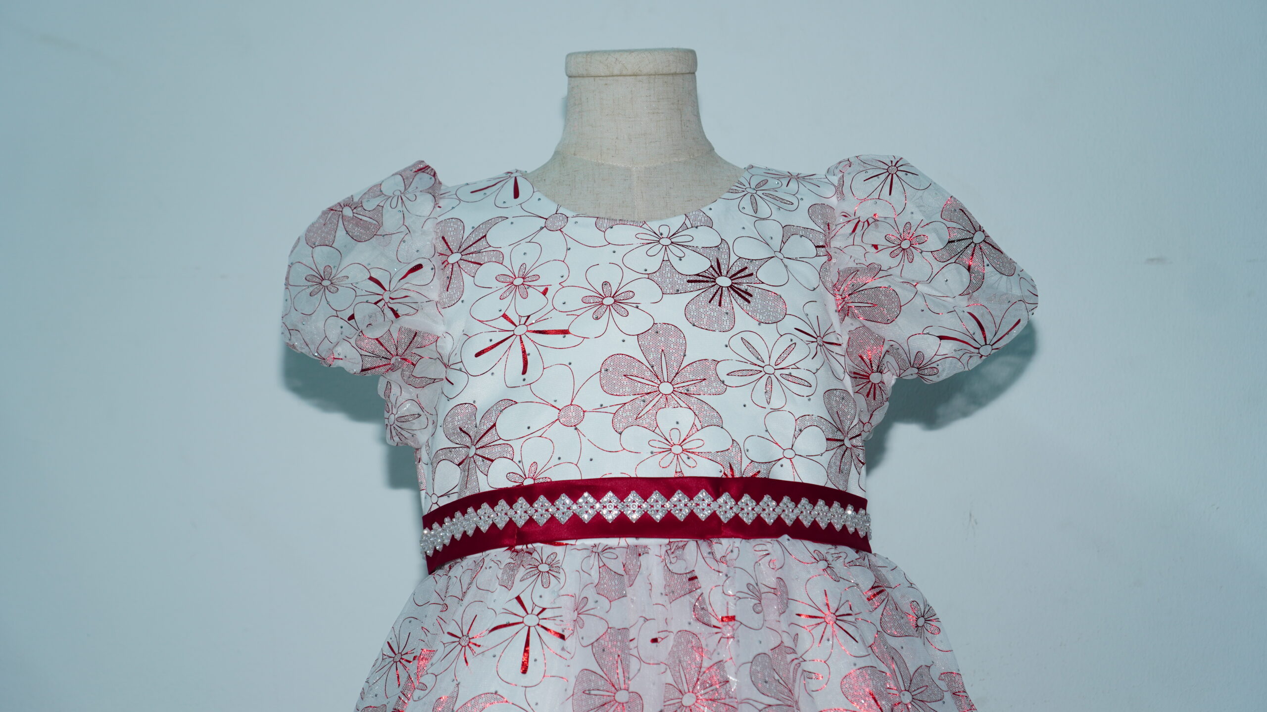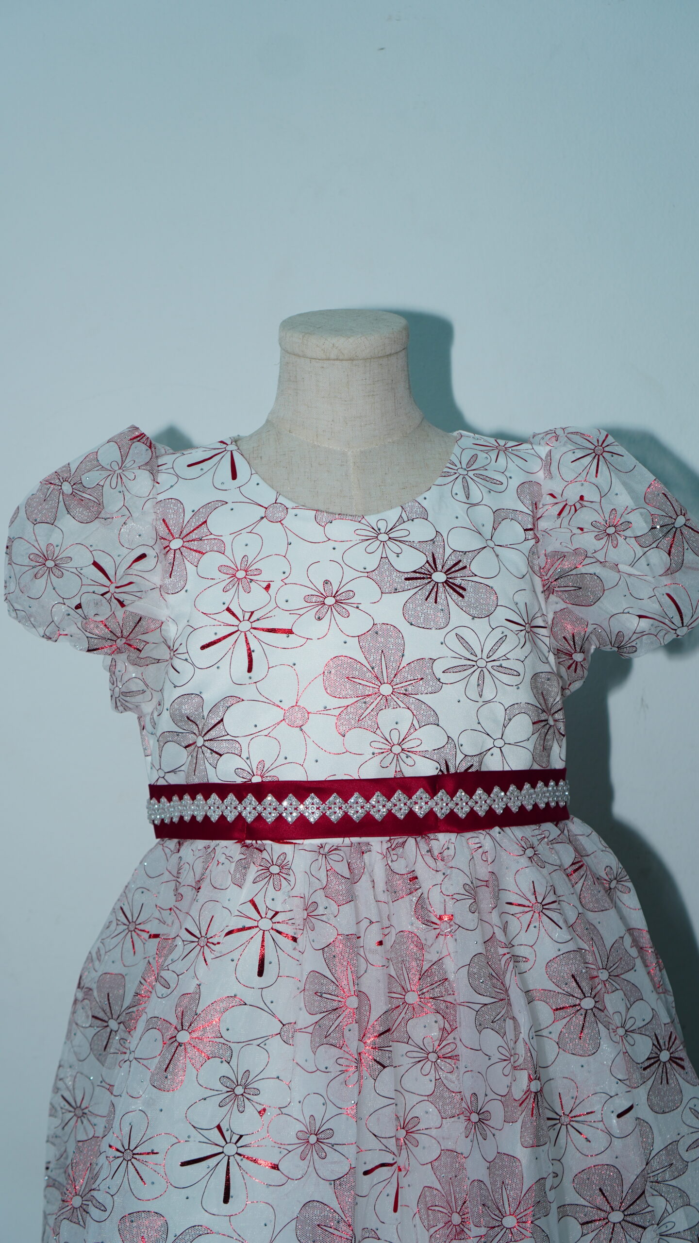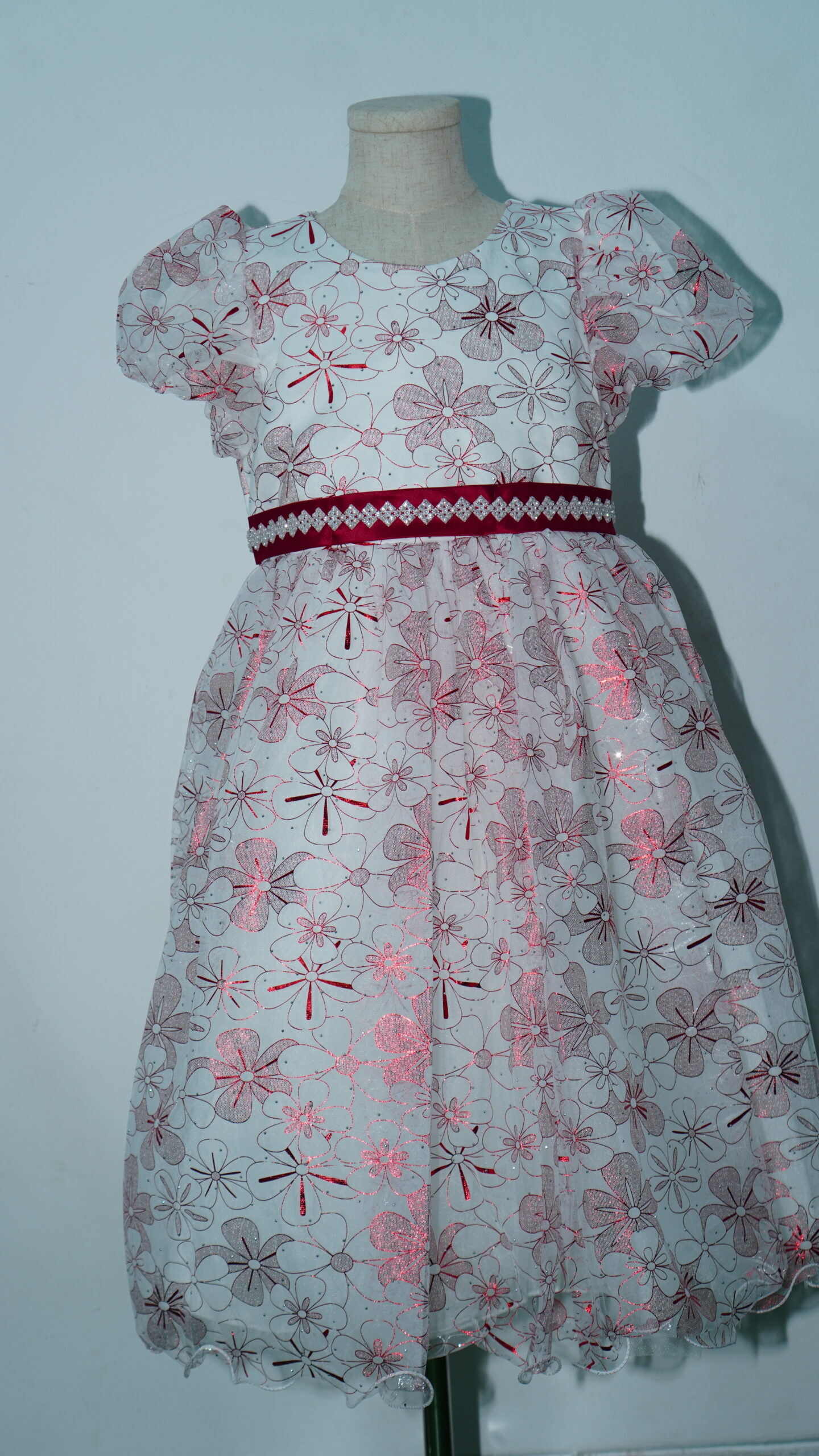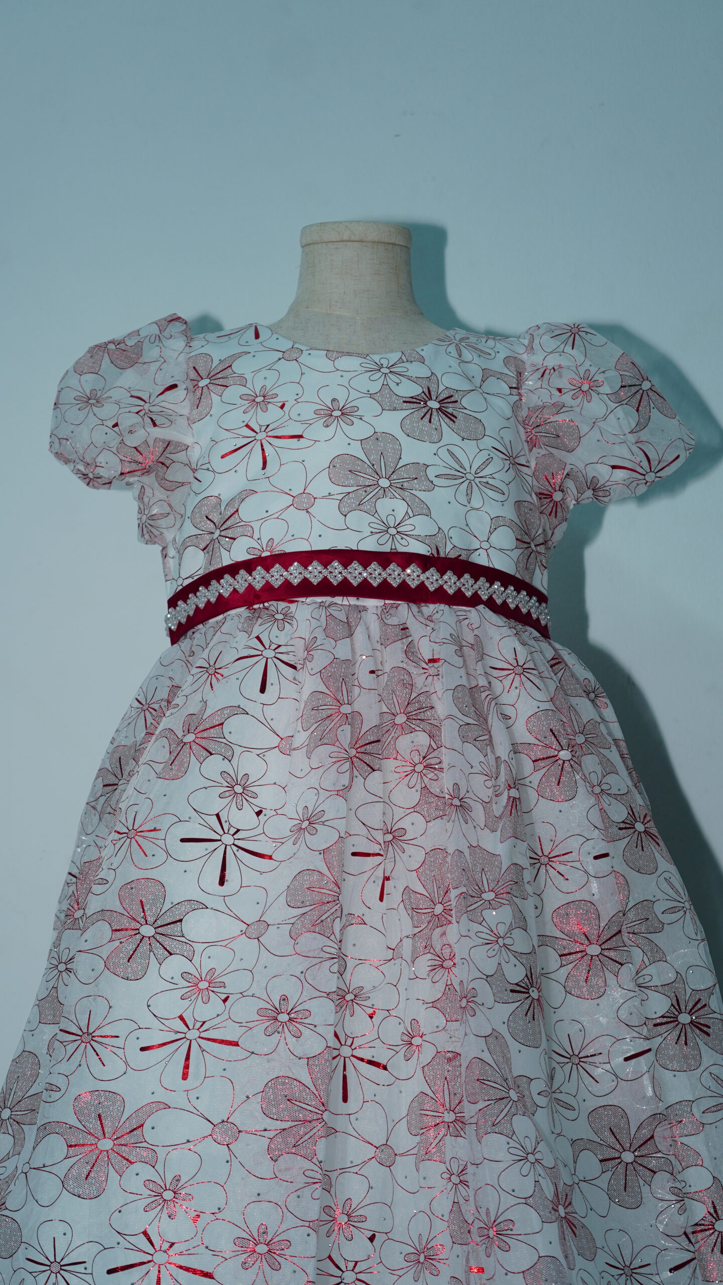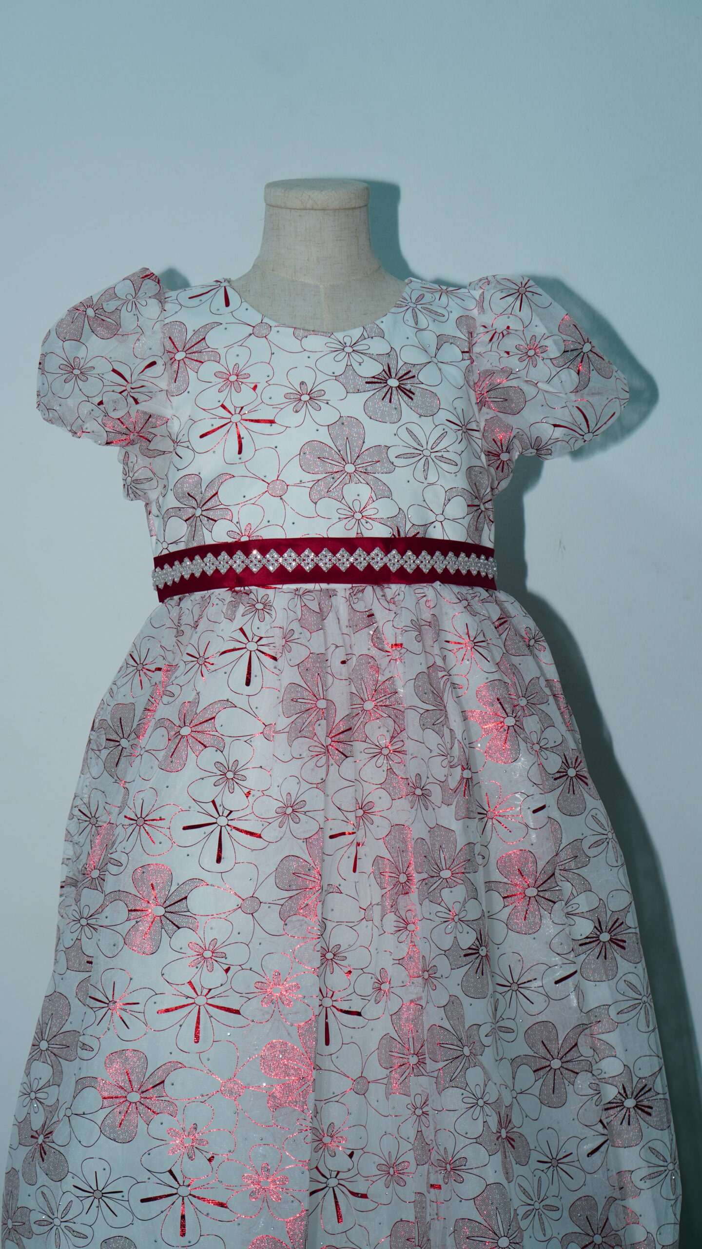 • Glistening Floral Overlay: The entire gown is wrapped in a high-quality white tulle overlay featuring a vibrant, all-over maroon floral pattern. The metallic shimmer within the red petals ensures she catches the light with every step.